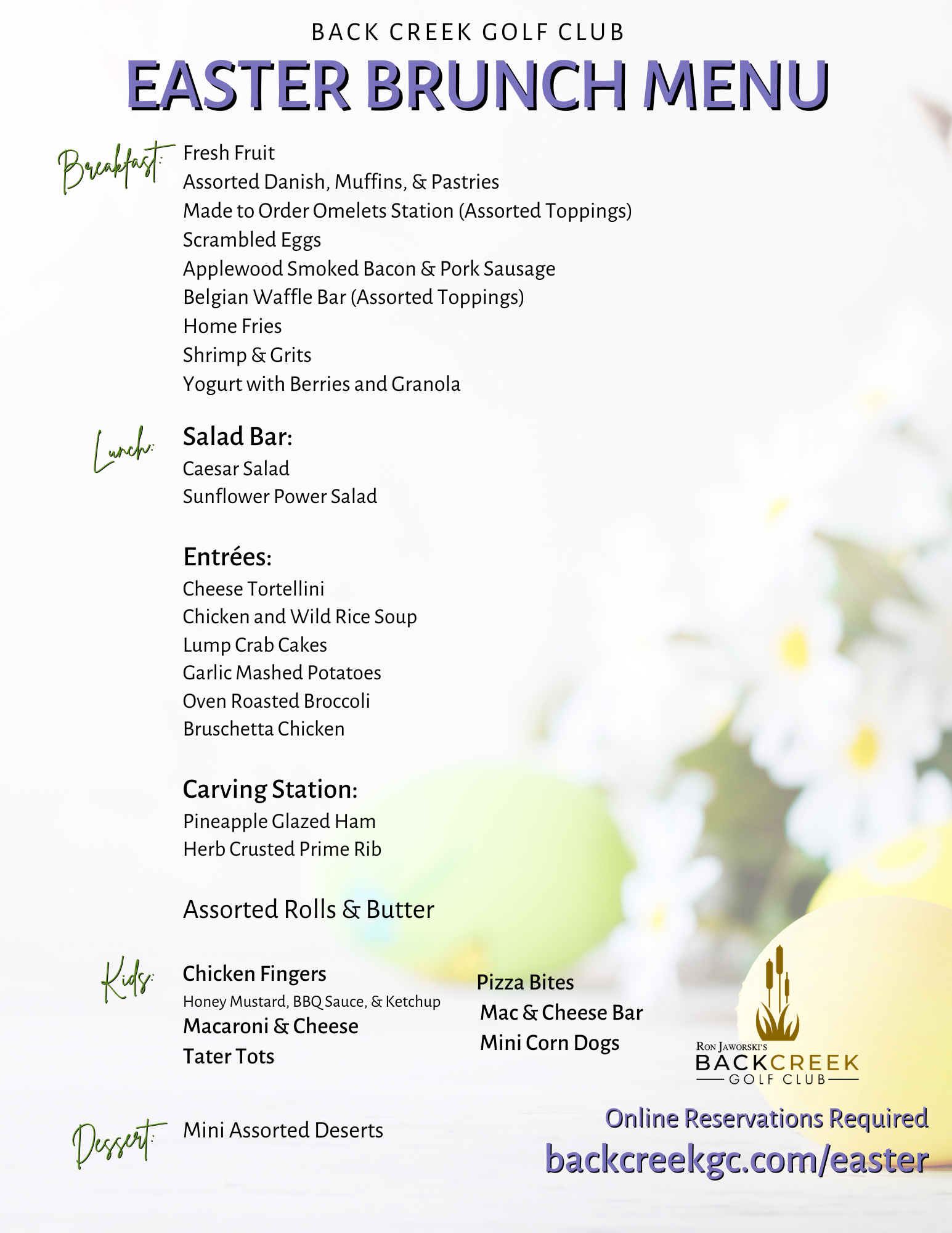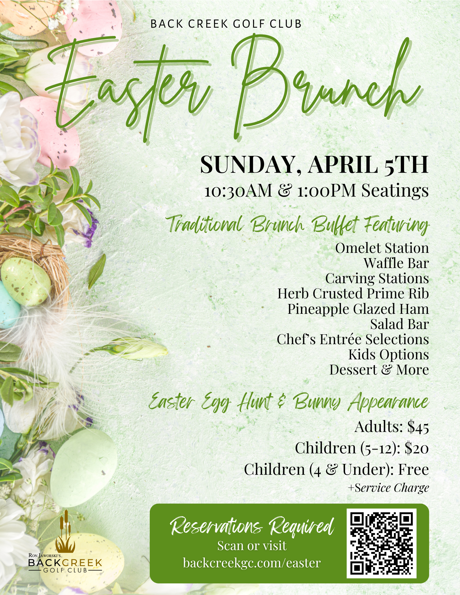 Hop on over to Back Creek Golf Club for our annual Easter Brunch! Our culinary team is preparing a decadent display of all of your favorites – including an Omelet Station, Waffle Bar, Carving Stations, Kids Buffet & more! Click below or scan the QR code to reserve your table. We can’t wait to serve you!