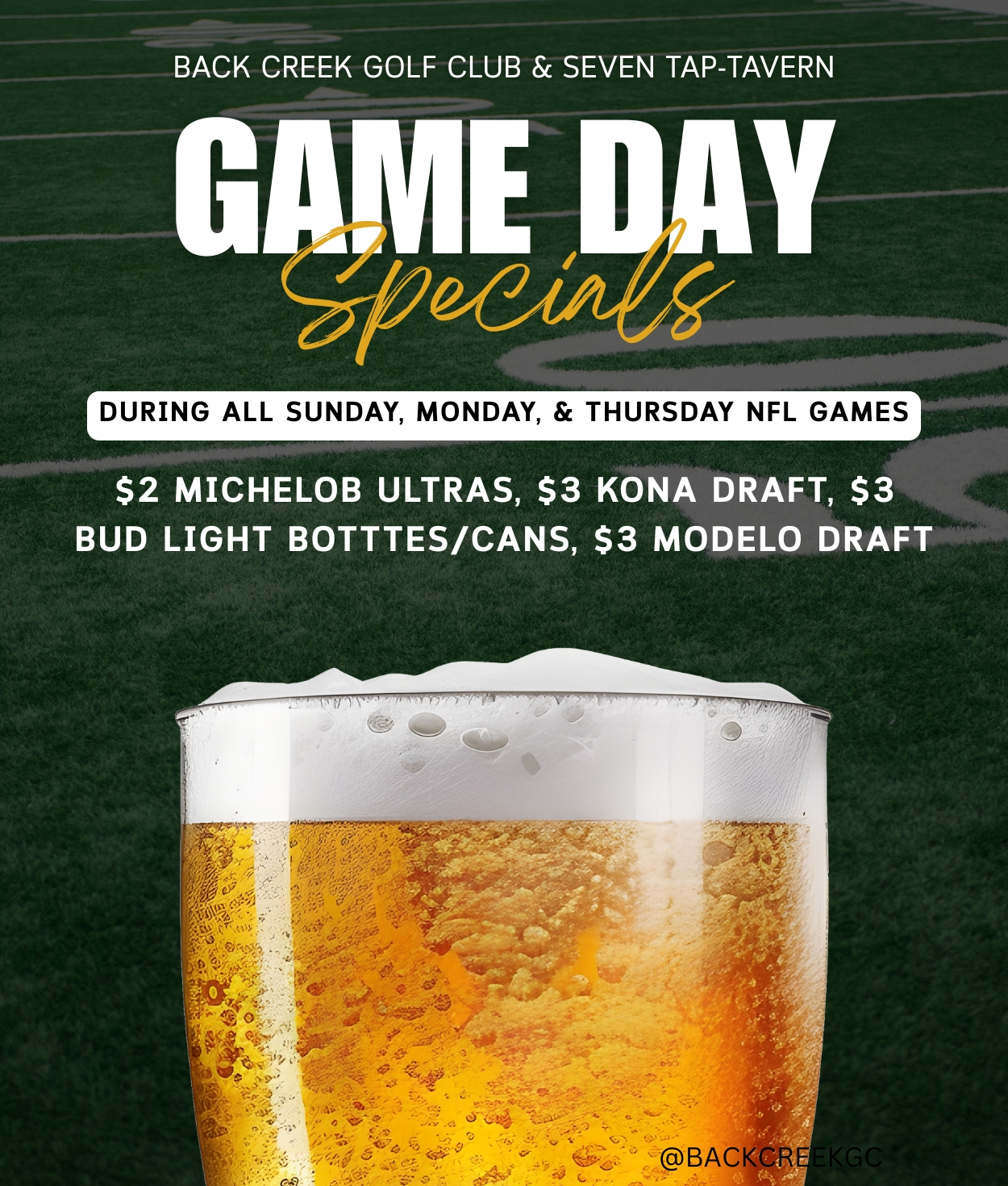 Join us at Back Creek Golf Club & Seven Tap-Tavern every Sunday, Monday, and Thursday during NFL games for unbeatable drink specials and an electric game day atmosphere.